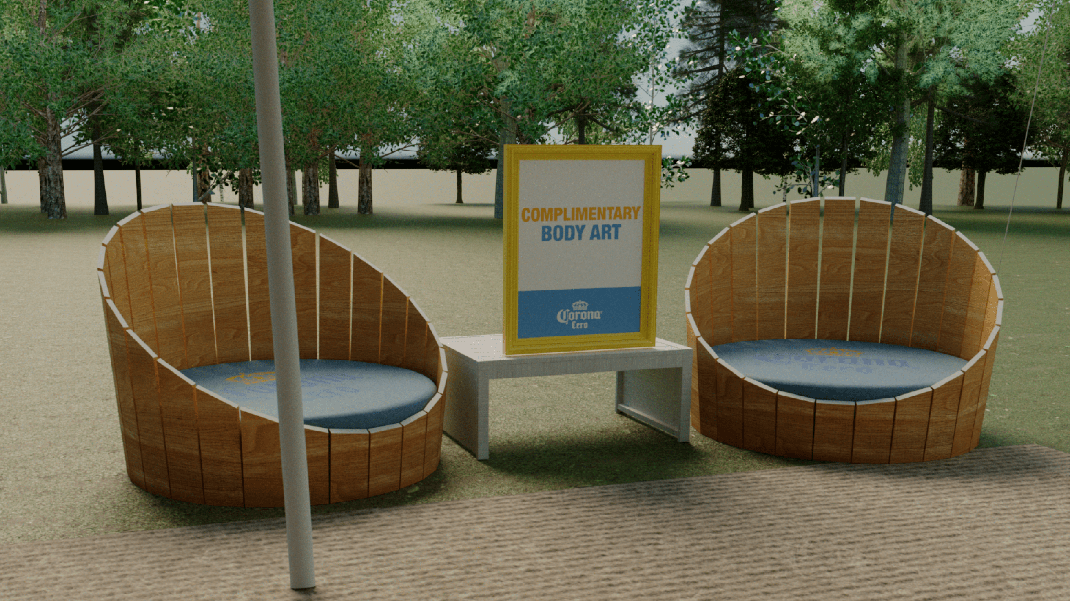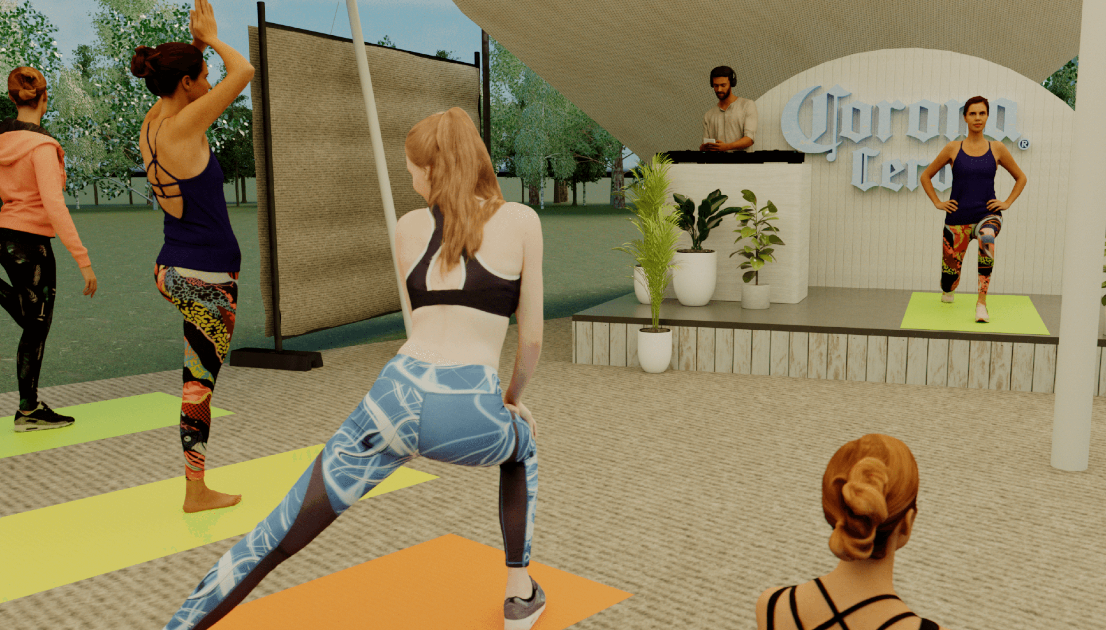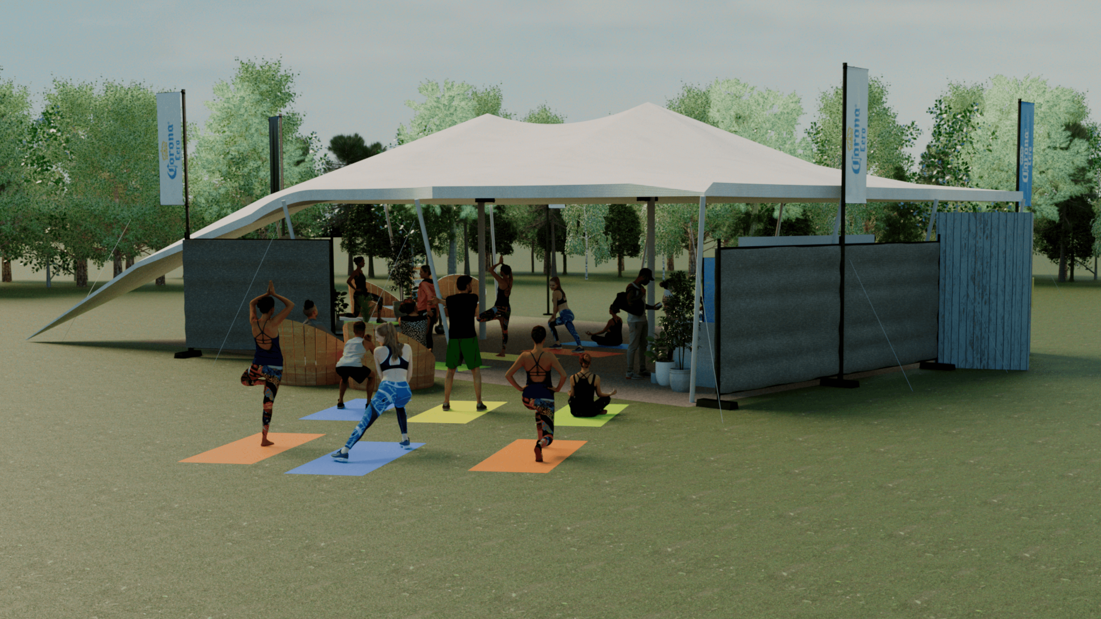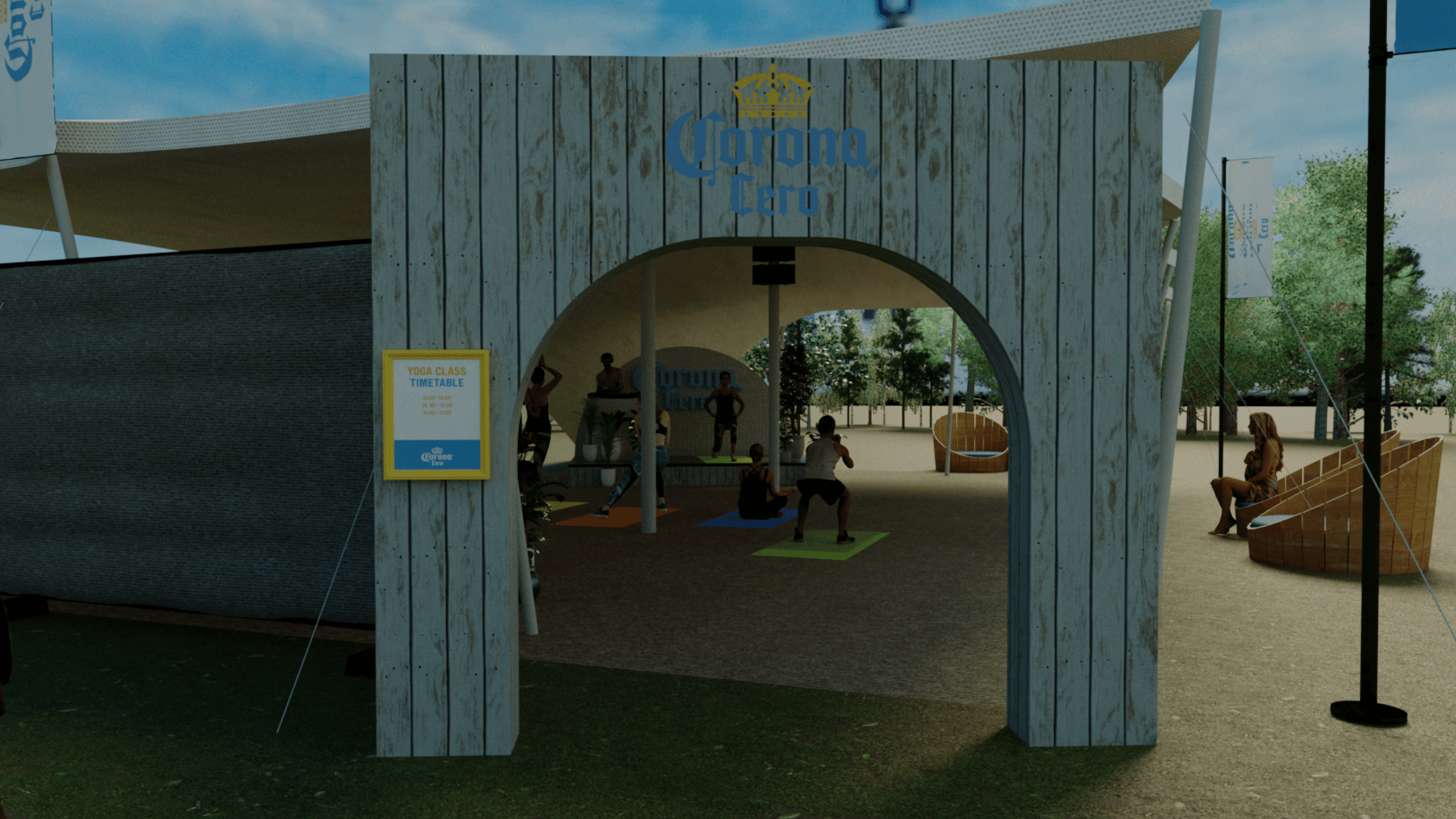 I created this 3D visualisation for Corona Zero’s space at WellFest, blending mindful movement with laid-back vibes. Think yoga under a canopy, a DJ spinning mellow beats, complimentary body art, and a branded bar that served refreshment without the hangover.